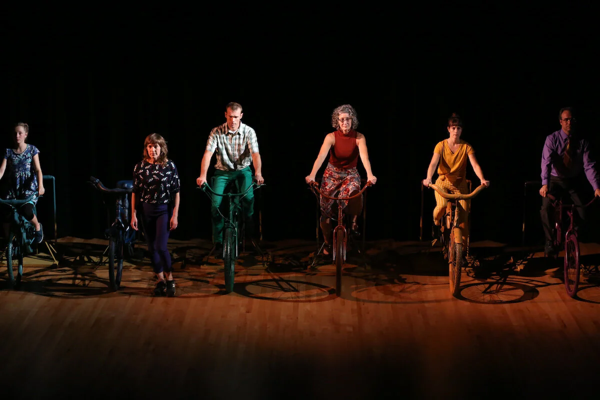 Created by Kuntz and Company, this dance piece is about family, friends, husbands, wives, children, siblings, love, relationships, caring, love, loss, joy, owls, play, love, sisters, dads, moms, boyfriends, kids, racing, pushups, breakdancing, love, girlfriends, armwrestling, supporting, love, jazzhands, hope, seeing, climbing, lifting, each other, penguins, each of the bars or wire rods connecting the center of a wheel to its outer edge, dancing, high-tens, love, holding on, letting go of her, pulling, love, strength, singing together, alone, coasting, falling, your people, love, bells, churning butter, monkeys, girls, boys…but it isn’t about bikes.